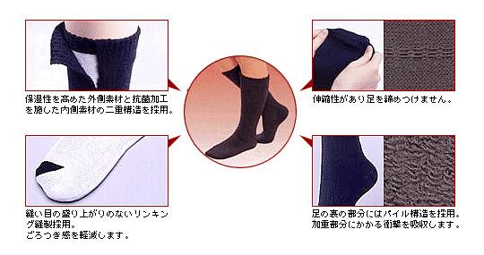 二重構造になっている靴下の外側には新素材を採用。吸湿性と、通気性にたいへん優れています。