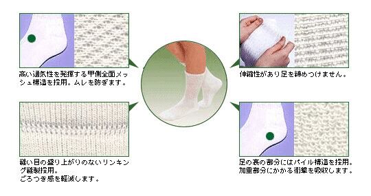 足を締め付けない、ソフトな履き心地で、つま先は縫目の盛り上がりがなく、摩擦や衝撃から肌を守ります。
